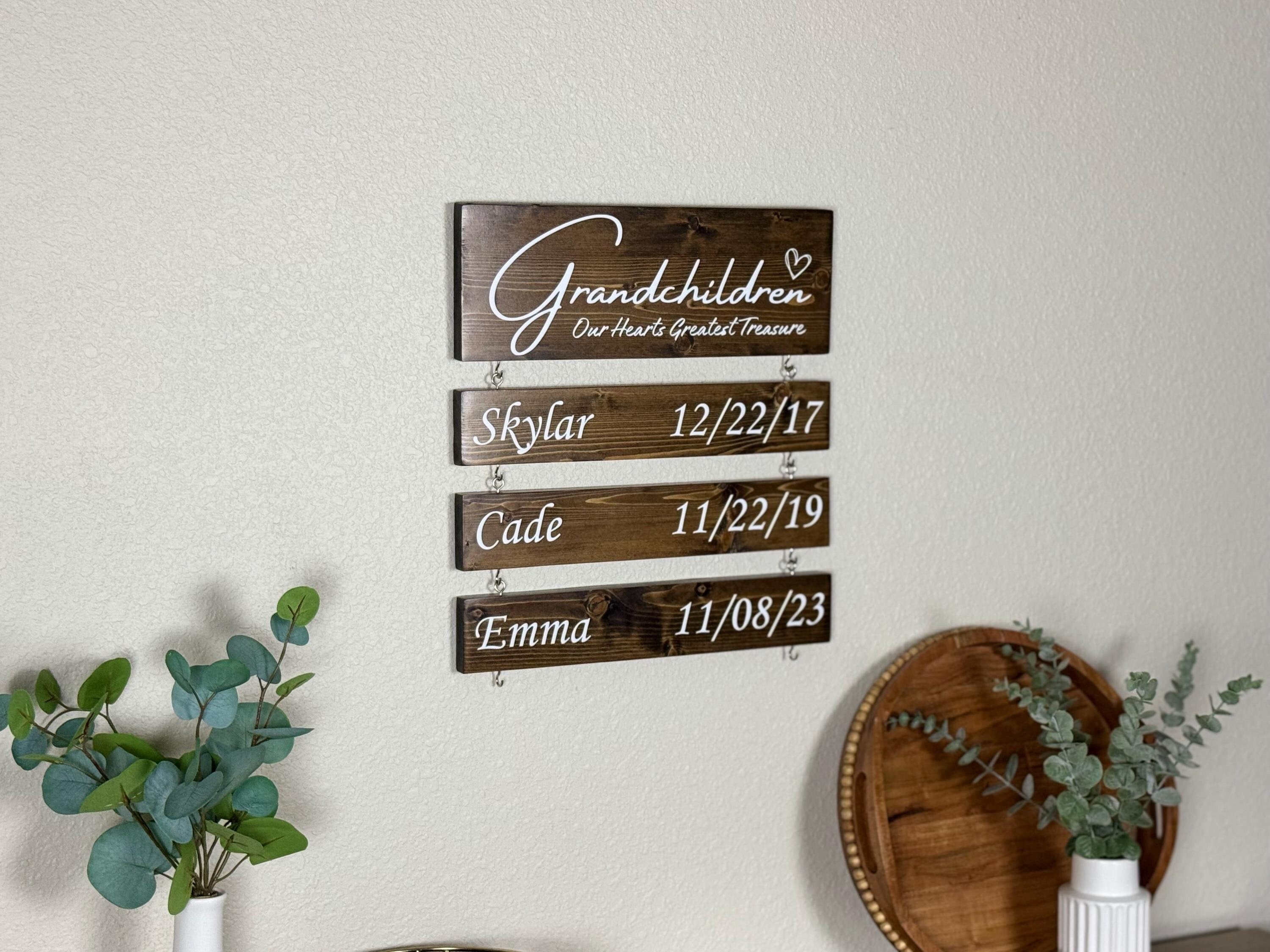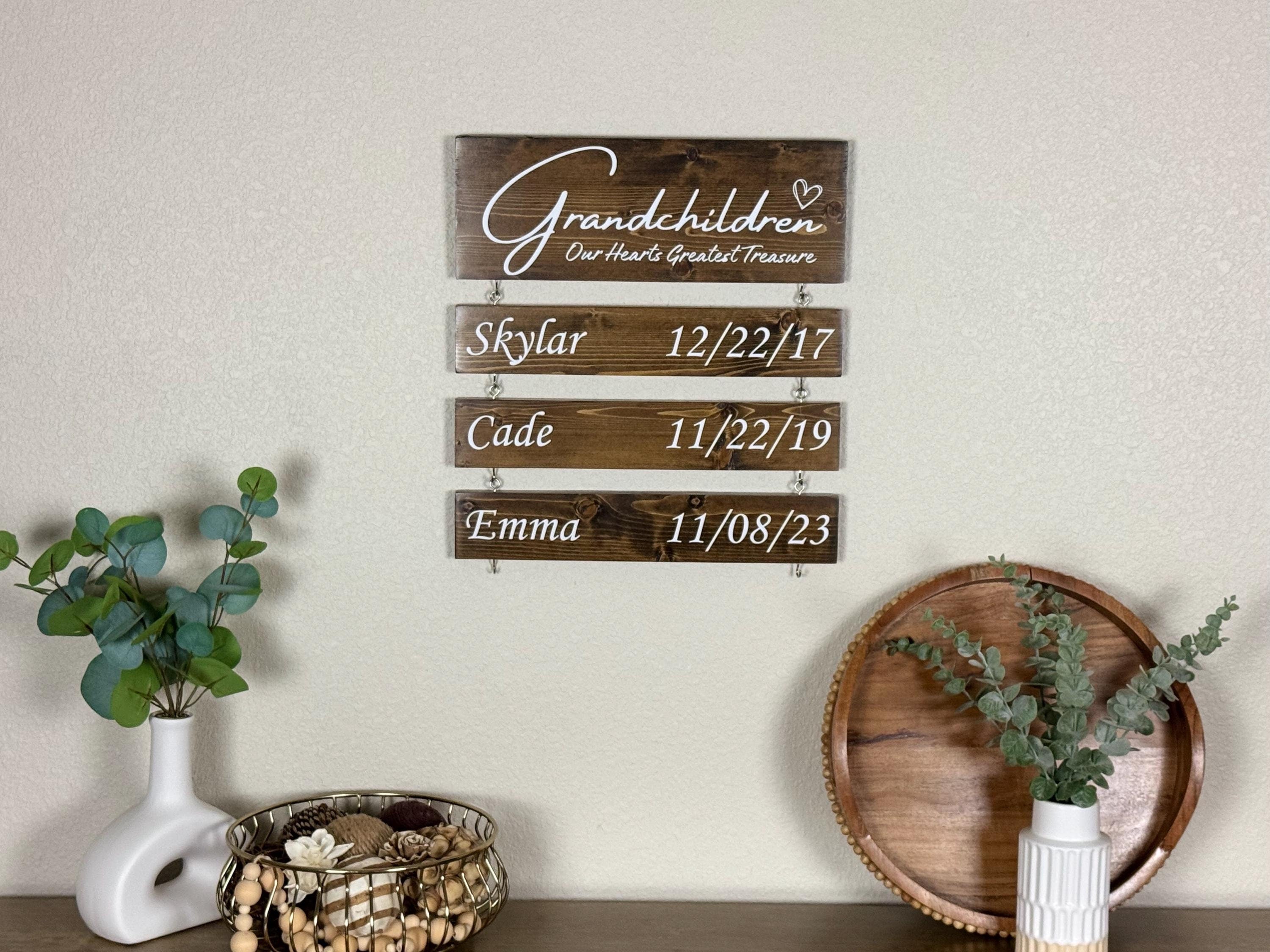 Custom Grandparent Sign with Grandkids Names & Birthdates. This rustic wood sign will light up your parents or grandparents' eyes as it reveals a sentimental quote with each of their grandchild's names and birthdates hanging. A sentimental gift that will be cherished year after year. The perfect gift for grandparents to memorialize their growing family that is filled with their grandchild and great grandchildren's names.