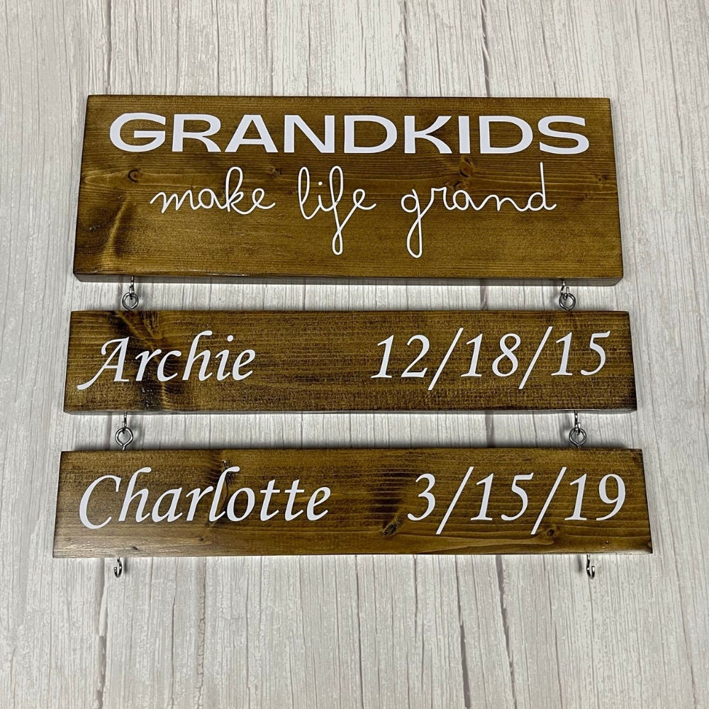 Custom Grandparent Sign with Grandkids Names & Birthdates. This rustic wood sign will light up your parents or grandparents' eyes as it reveals a sentimental quote with each of their grandchild's names and birthdates hanging. A sentimental gift that will be cherished year after year. The perfect gift for grandparents to memorialize their growing family that is filled with their grandchild and great grandchildren's names. This sign has the saying "Grandkids Make Life Grand".