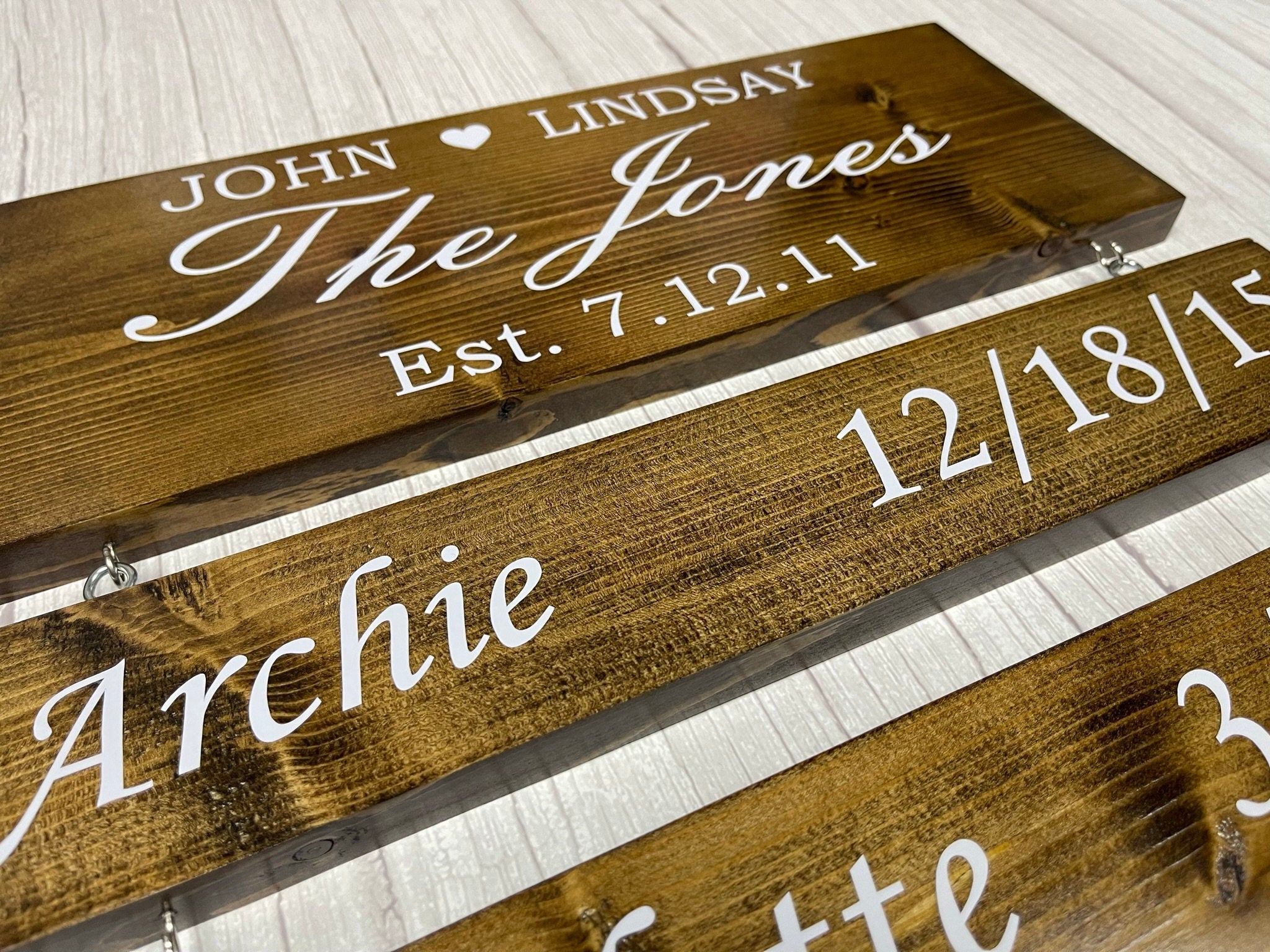 This is a one of a kind gift idea! Personalized wood sign with the family name and kids names listed on individual name plaques. Custom established sign to celebrate an anniversary.
