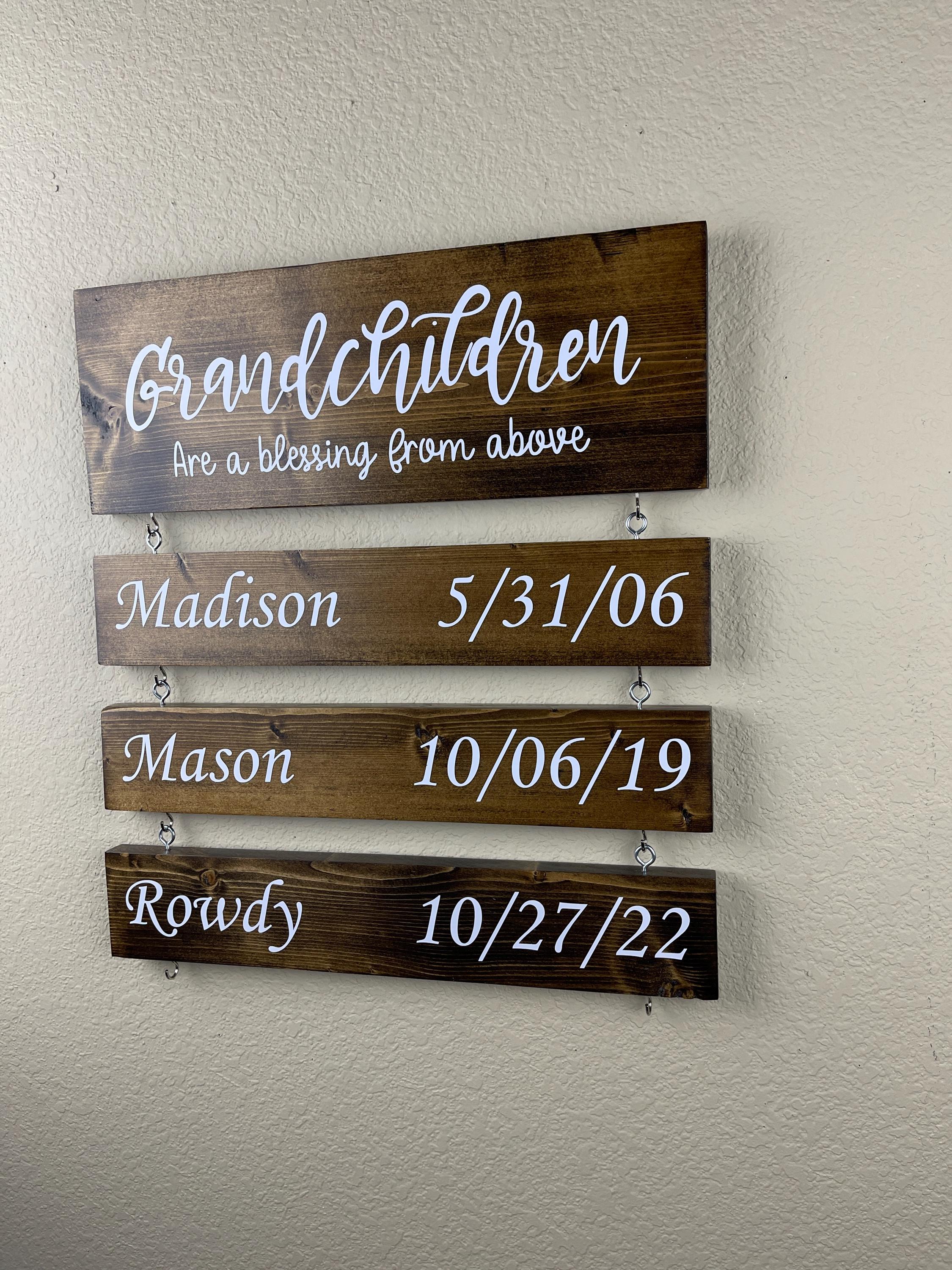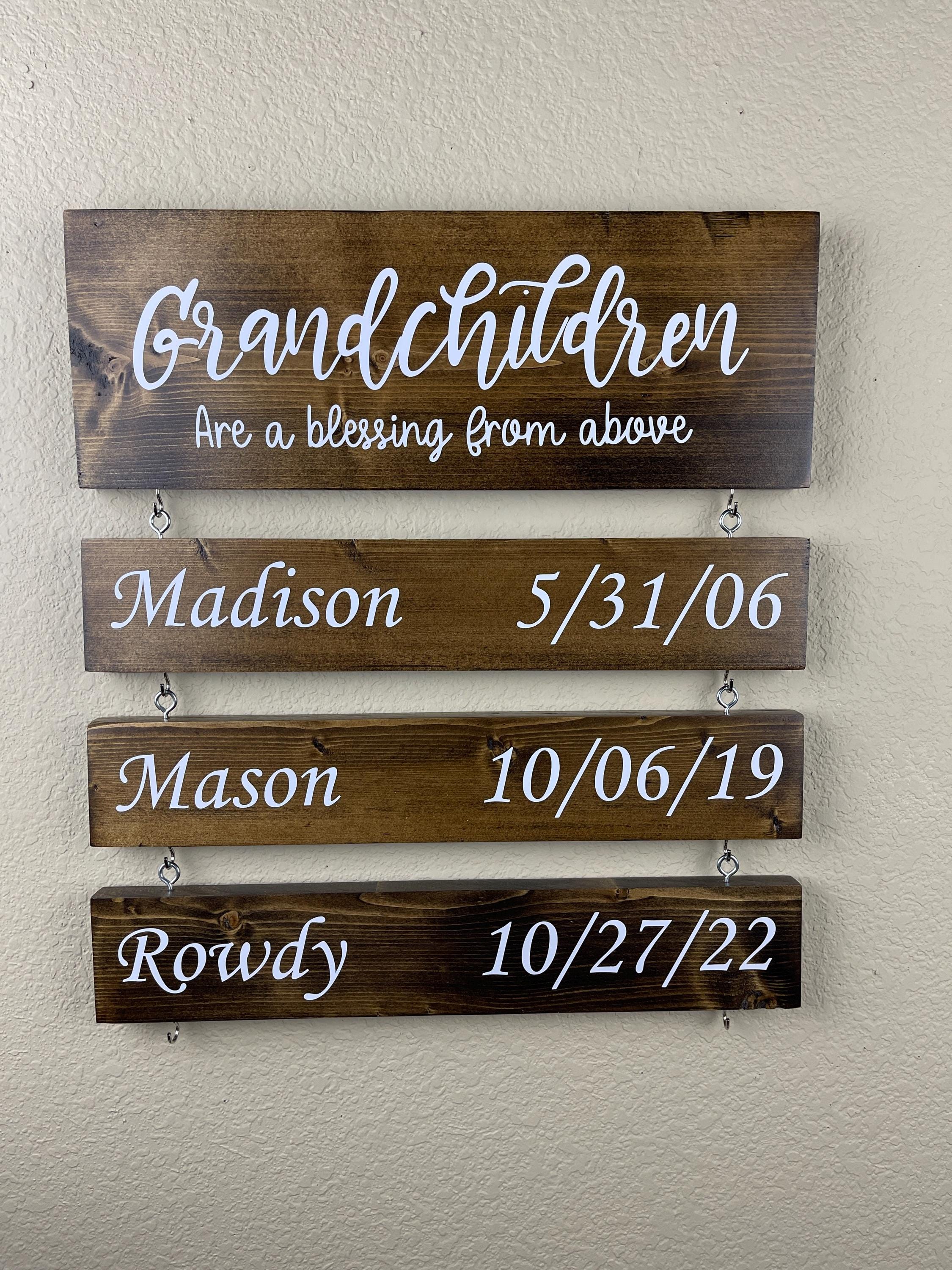 Custom Grandparent Sign with Grandkids Names & Birthdates. This rustic wood sign will light up your parents or grandparents' eyes as it reveals a sentimental quote with each of their grandchild's names and birthdates hanging. A sentimental gift that will be cherished year after year. The perfect gift for grandparents to memorialize their growing family that is filled with their grandchild and great grandchildren's names. Perfect for your parents with a growing family.