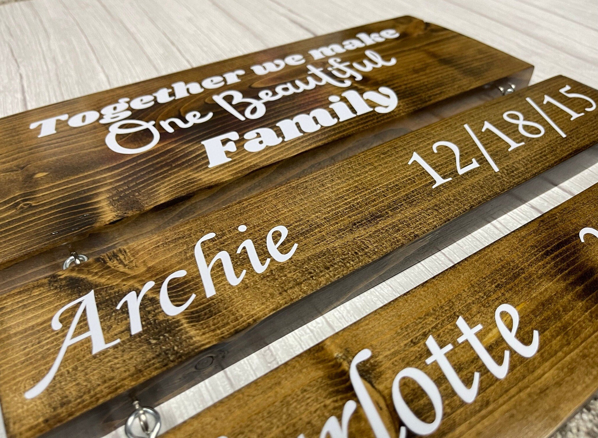 The sign is designed to be an heirloom in your family. As the family grows it is easy to add on with the hooks. When a new little one enters the world come back to this listing and purchase the "Name Board Only" option.