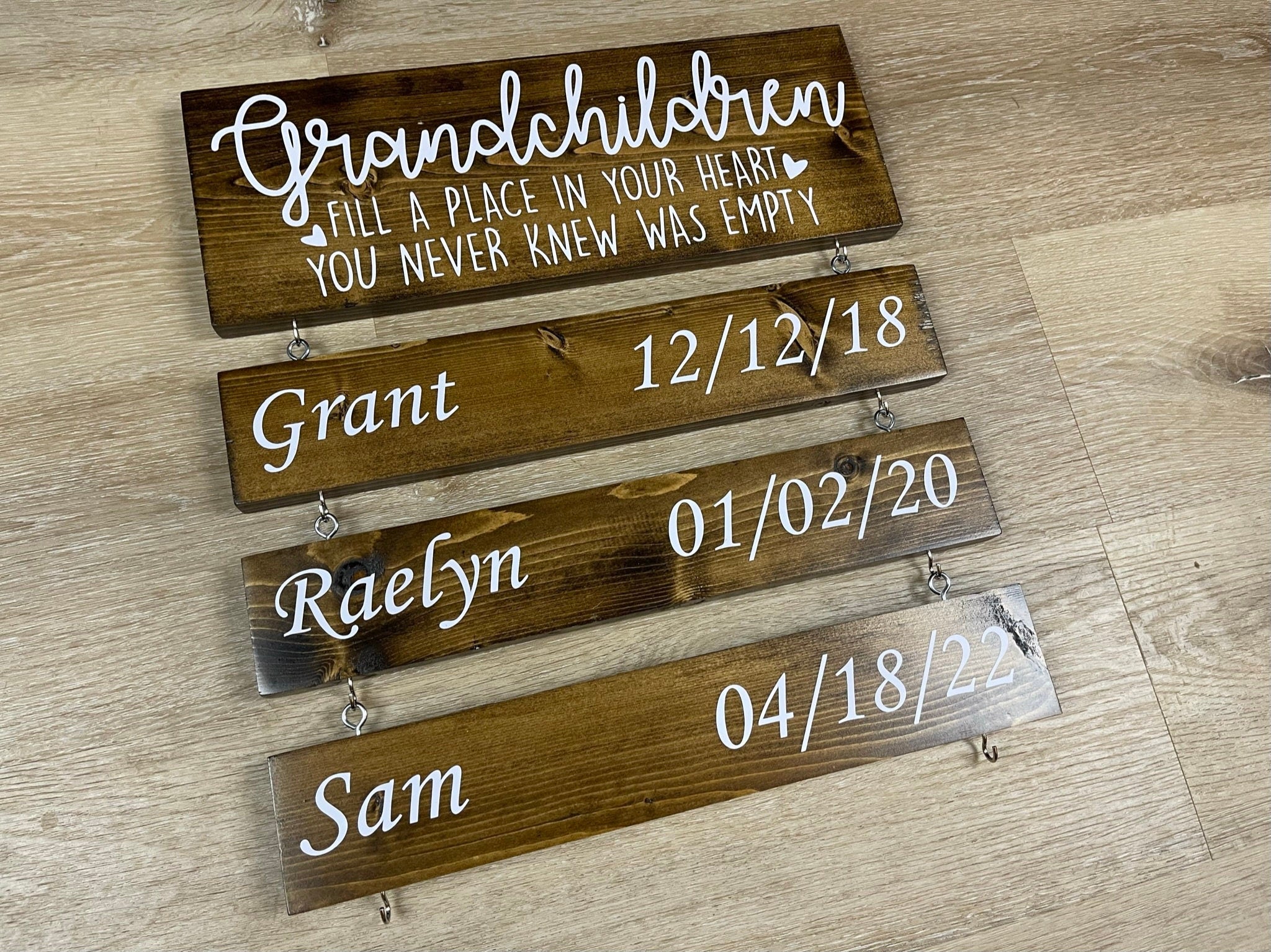 This Personalized Wooden Grandparents' Sign is the perfect gift for any grandparent who wants to show off their love for their grandchildren. The sign is beautifully crafted from high-quality wood and features the heartfelt quote, "Grandchildren Fill a Place in Your Heart You Never Knew Was Empty." At 15 inches wide, 5.5 inches tall, and .75 inches deep, this sign is the perfect size to hang in any room or on any wall. The sign is also customizable with the names and birthdates of the grandkids, making it a truly personalized gift.